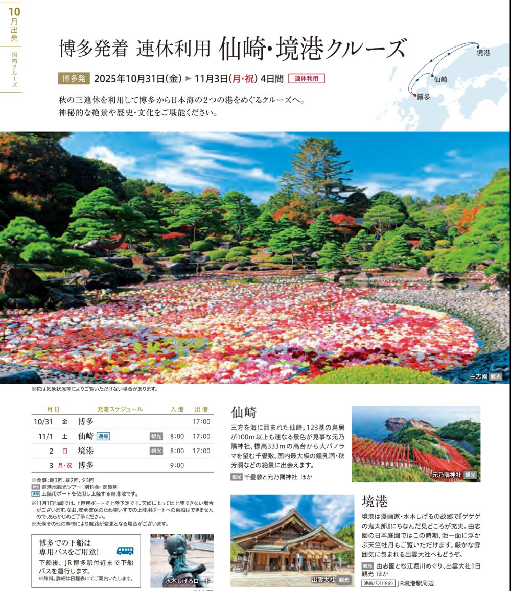 博多発着 連休利用 仙崎・境町クルーズ 4日間: 10/31(金)-11/3(月・祝)