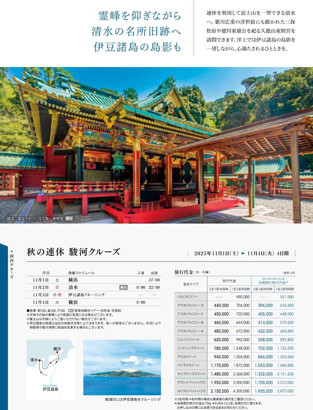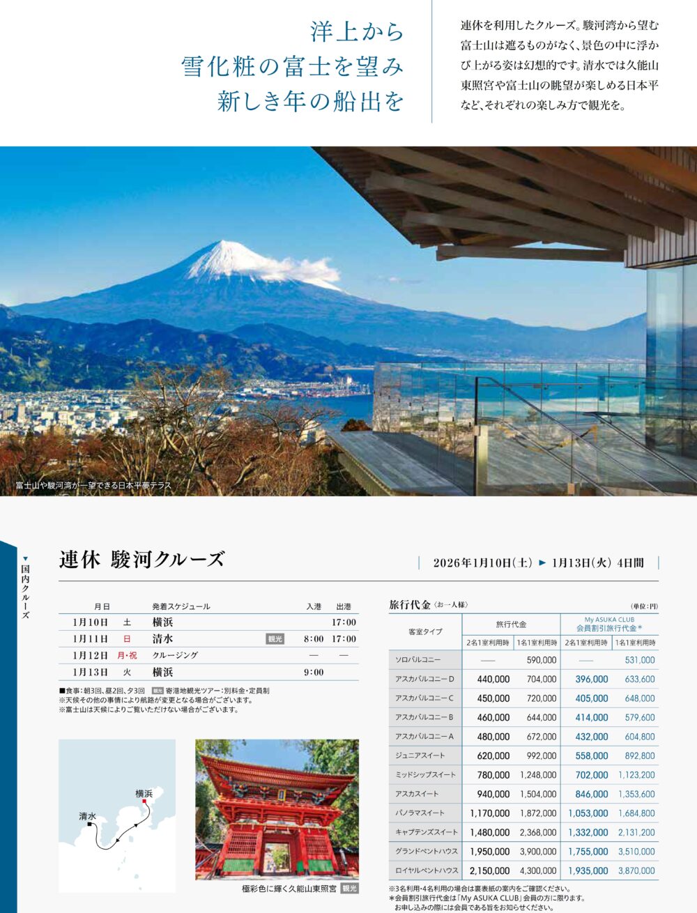 | 連休 駿河クルーズ 4日間: | 1月10日(土)〜1月13日(火) | 396,000 円~ | HISで確認 |