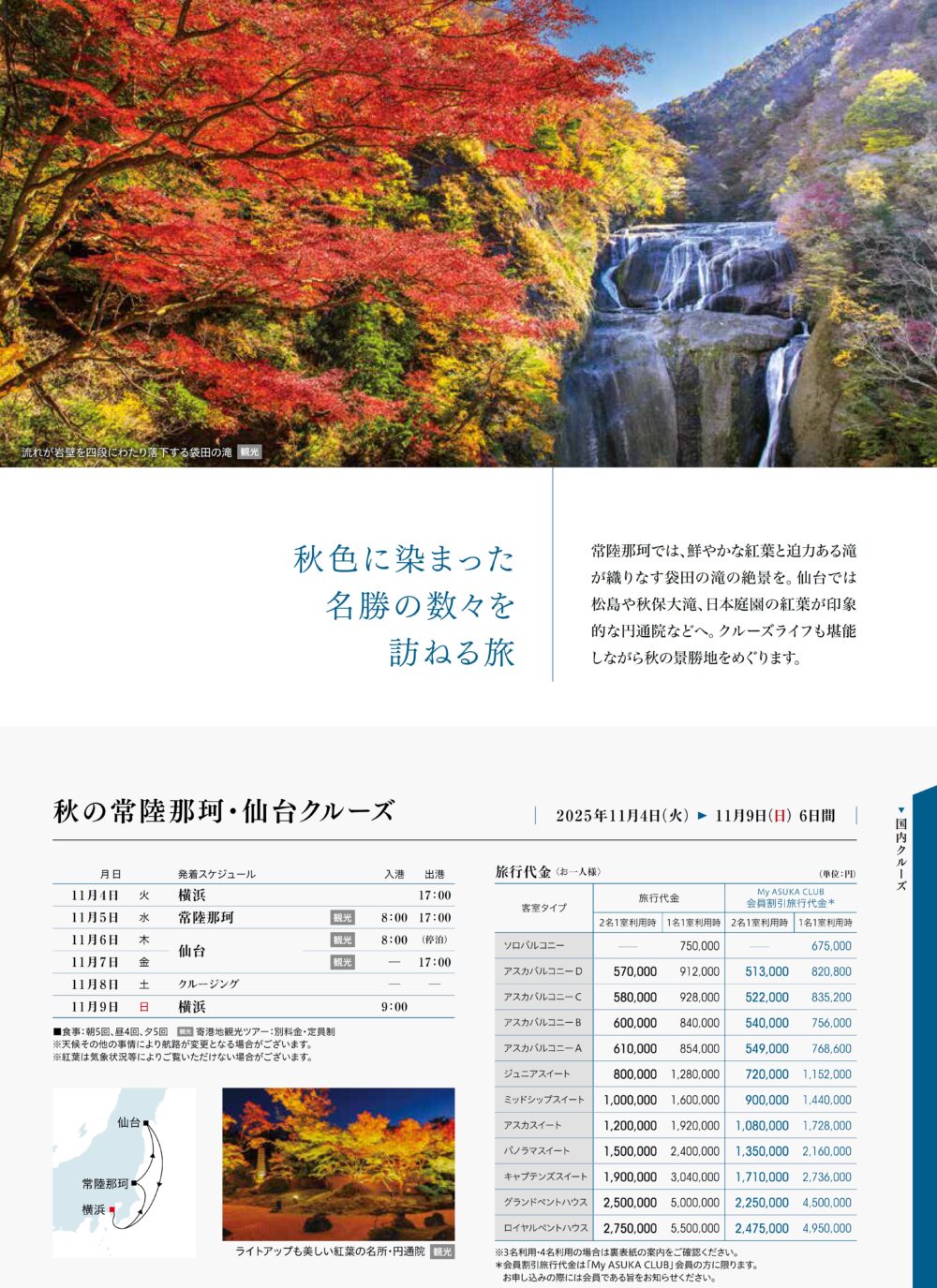 | 秋の常陸那珂・仙台クルーズ 6日間 | 11月4日(火)〜11月9日(日) | 513,000 円~ | HISで確認 |