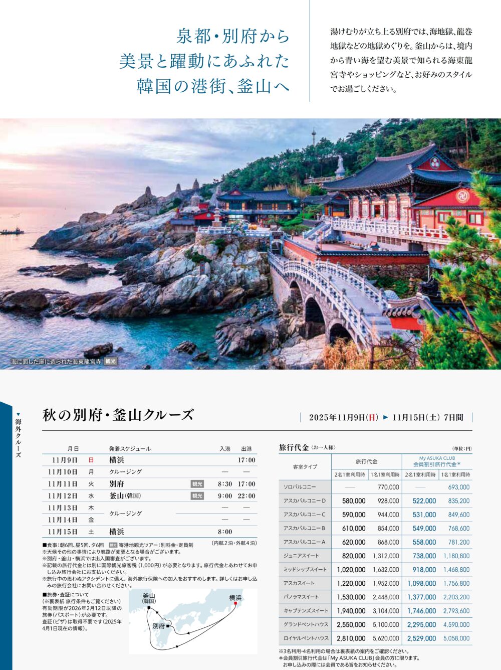 | 秋の別府・釜山クルーズ 7日間 | 11月9日(日)〜11月15日(土) | 522,000 円~ | JTBで確認 |