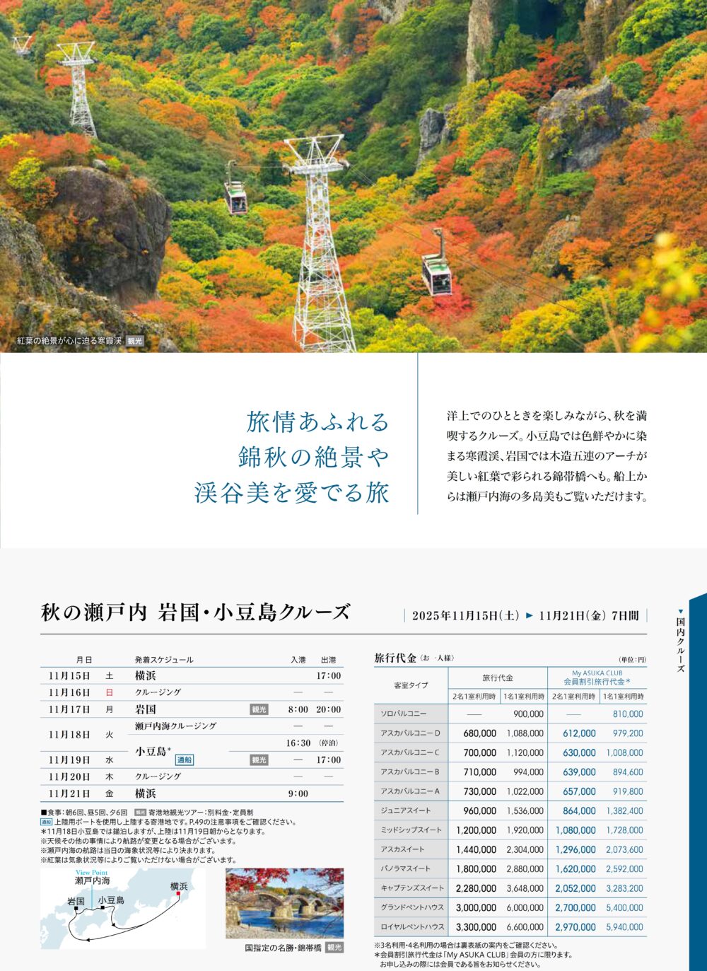| 秋の瀬戸内 岩国・小豆島クルーズ 7日間: | 11月15日(土)〜11月21日(金) | 612,000 円~ | HISで確認 |