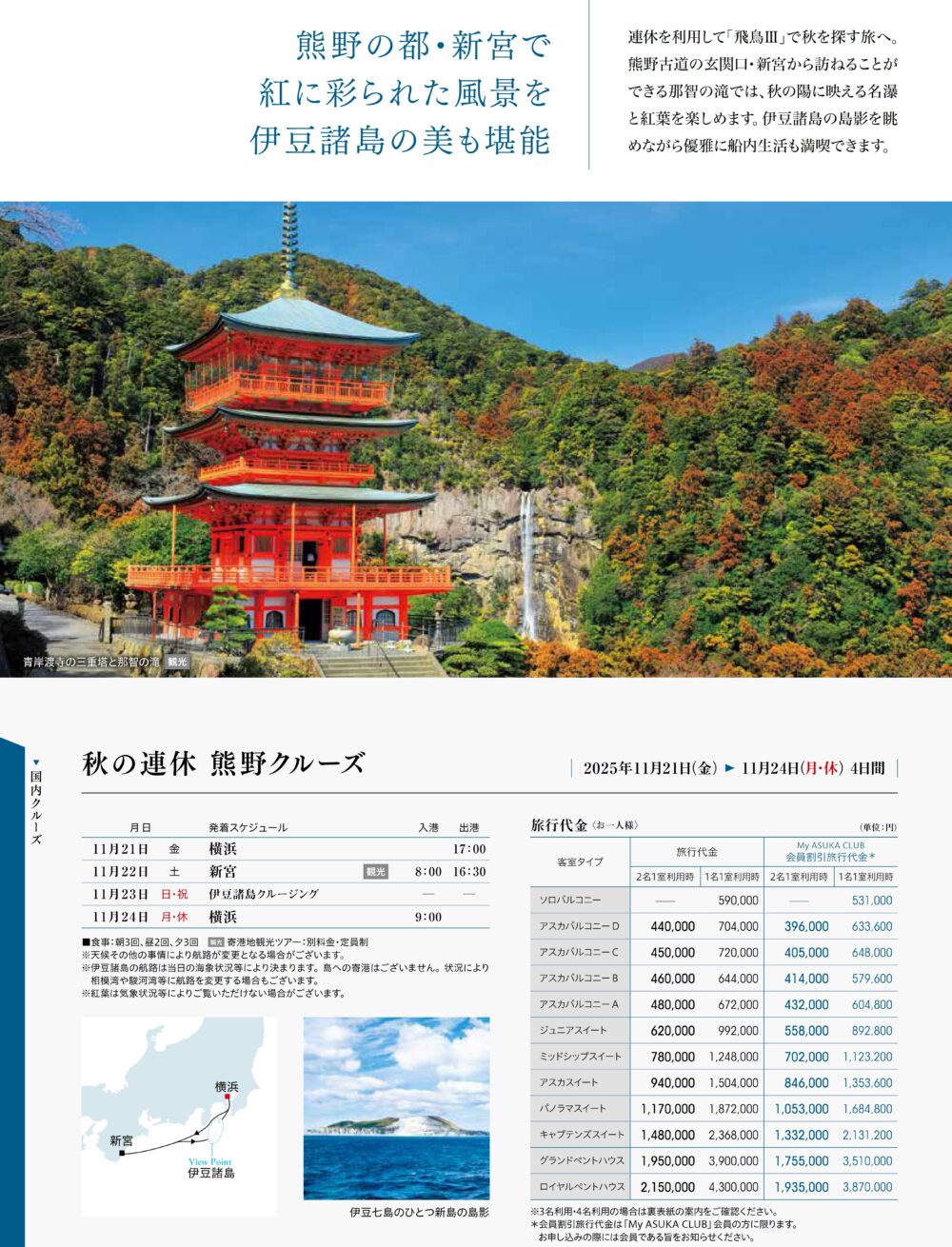 | 横浜発 秋の新宮・名古屋クルーズ | 10/19(日)~10/21(火) | 2泊3日 | 150,000円~ | 横浜 | HISで確認 |