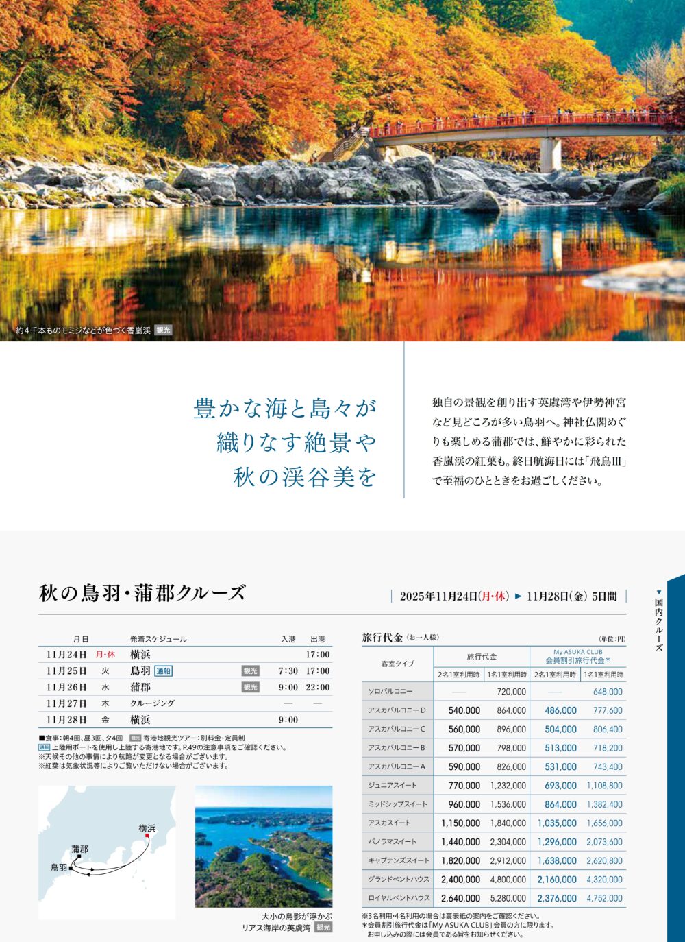 | 秋の鳥羽・蒲郡クルーズ 5日間: | 11月24日(月・休)〜11月28日(金) | 486,000 円~ | HISで確認 |