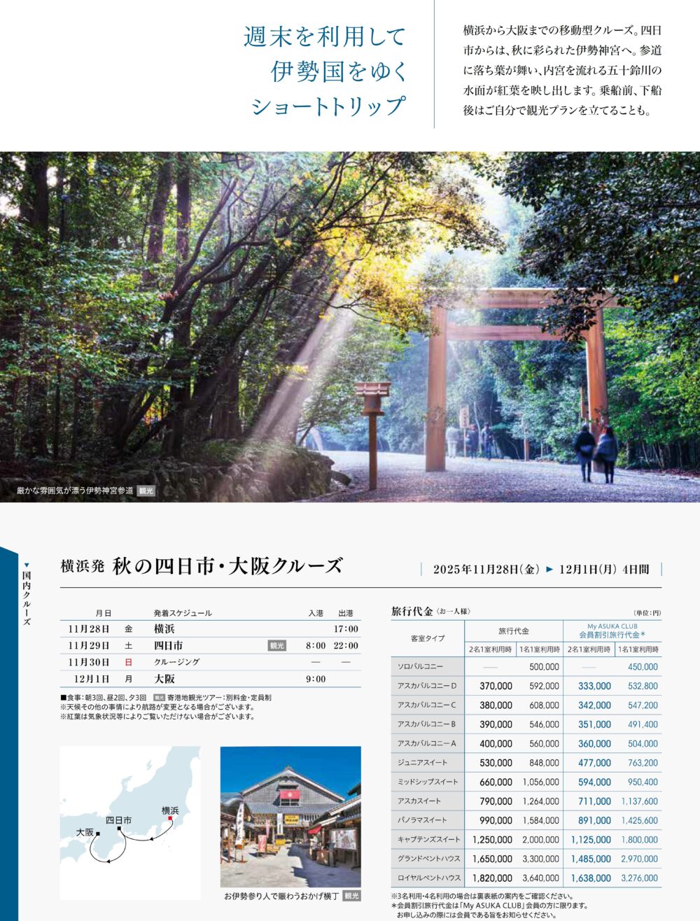 | 秋の四日市・大阪クルーズ 4日間 | 2025年11月28日(金)〜12月1日(月) | 333,000 円~ | HISで確認 |