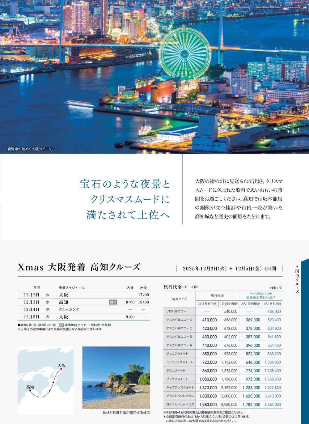 | Xmas 大阪発着 高知クルーズ 4日間 | 2025年12月2日(火)〜12月5日(金) | 369,000 円~ | HISで確認 |