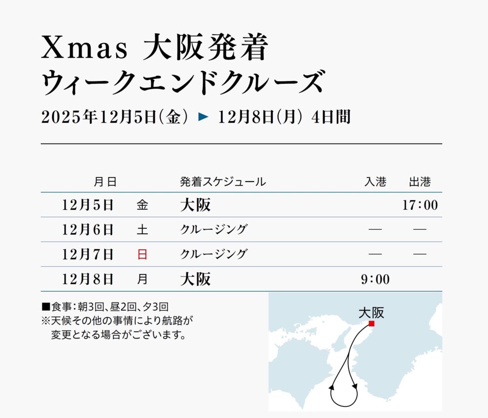 | Xmas 大阪発着 ウィークエンドクルーズ 4日間 | 12月5日(金)〜12月8日(月) | 396,000 円~ | HISで確認 |