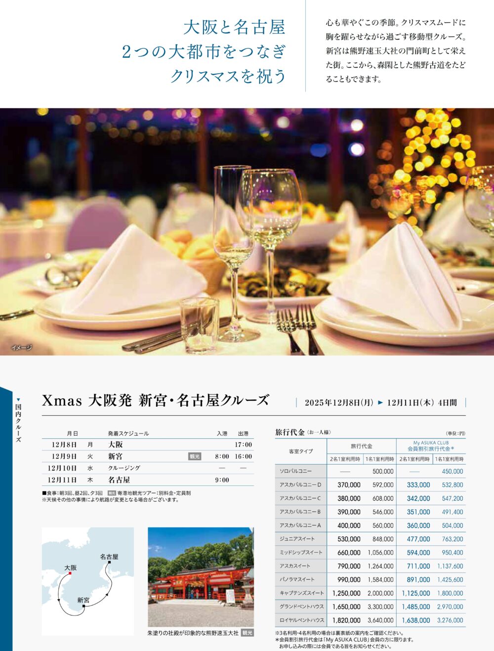 | Xmas 大阪発 新宮・名古屋クルーズ 4日間 | 12月8日(月)〜12月11日(木) | 333,000 円~ | HISで確認 |
