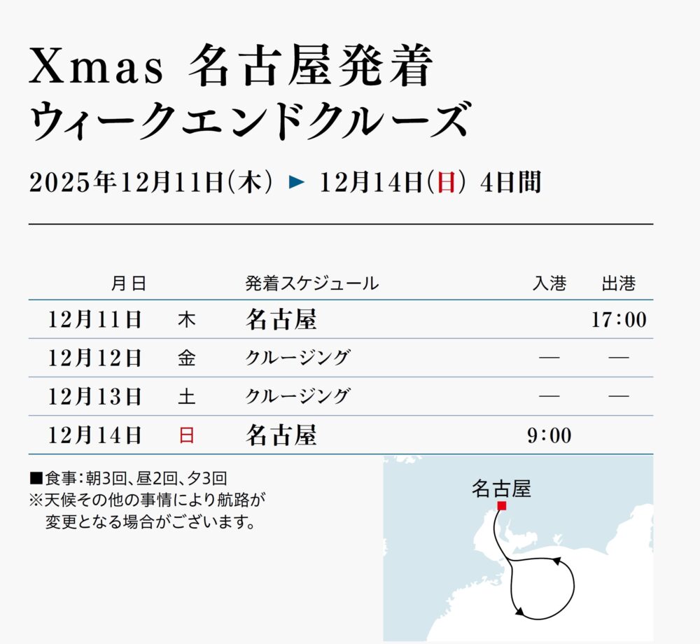 | Xmas 名古屋発着 ウィークエンドクルーズ 4日間 | 12月11日(木)〜12月14日(日) | 396,000 円~ | HISで確認 |