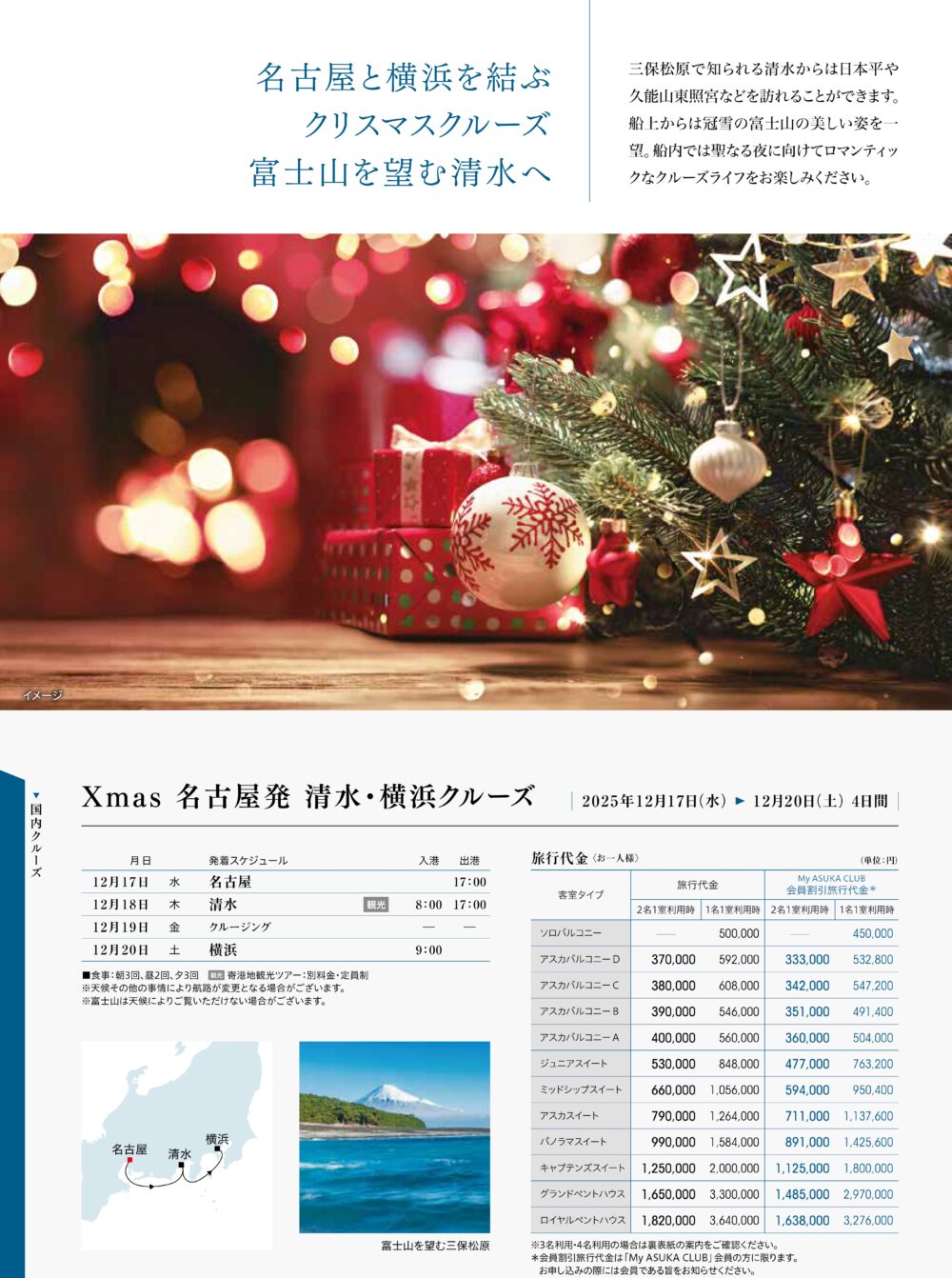 | Xmas 名古屋発 清水・横浜クルーズ 4日間 | 12月17日(水)〜12月20日(土) | 333,000 円~ | HISで確認 |