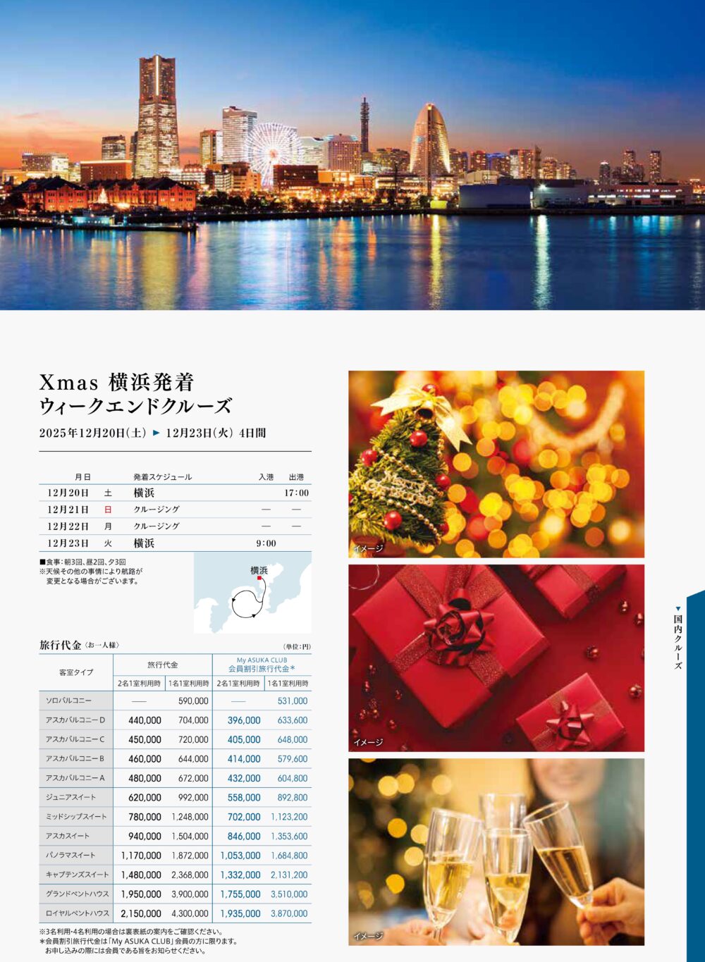 | Xmas 横浜発着 ウィークエンドクルーズ 4日間 | 12月20日(土)〜12月23日(火) | 396,000 円~ | HISで確認 |