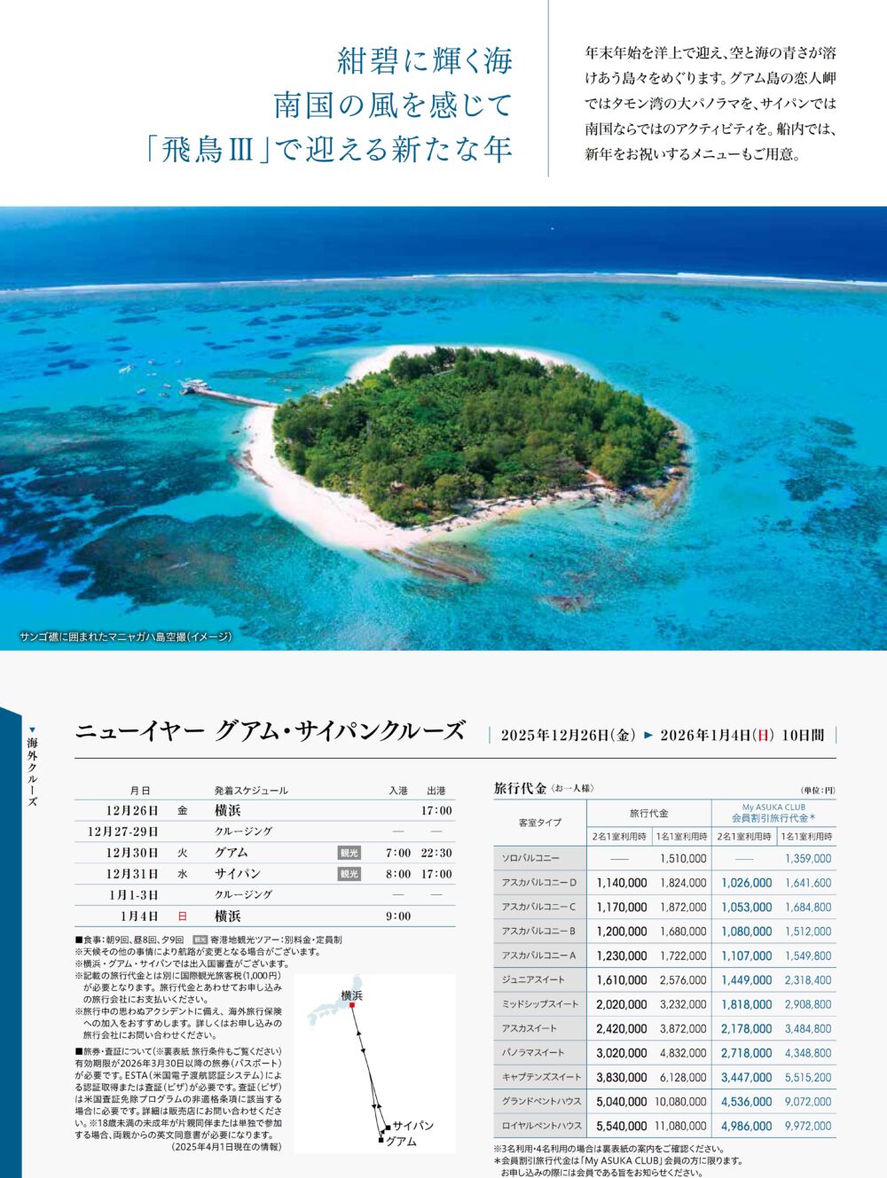 | ニューイヤー グアム・サイパンクルーズ 10日間 | 12月26日(金)〜2026年1月4日(日) | 1,026,000 円~ | HISで確認 |