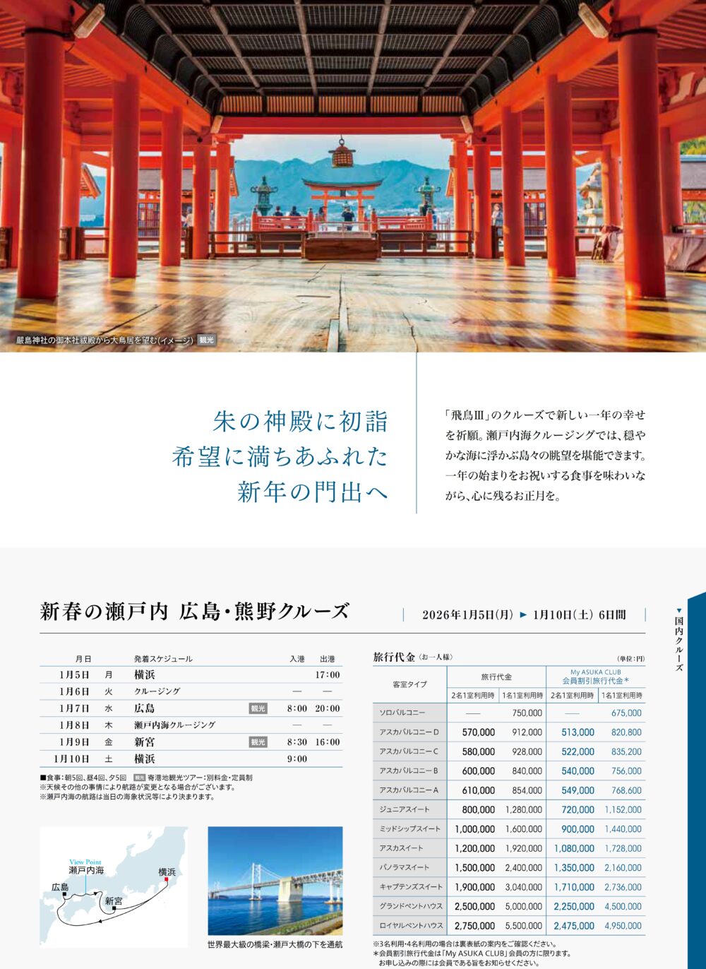 | 新春の瀬戸内 広島・熊野クルーズ 6日間 | 1月5日(月)〜1月10日(土) | 513,000 円~ | HISで確認 |