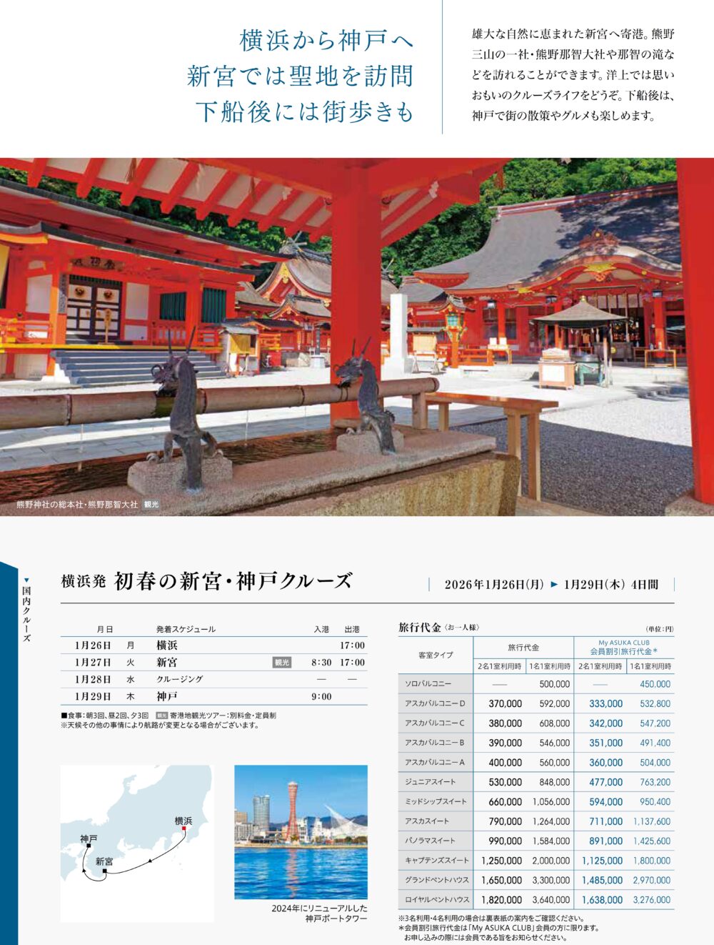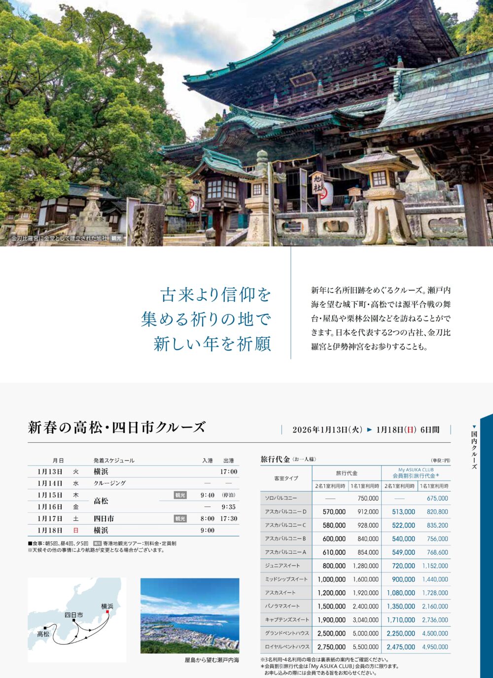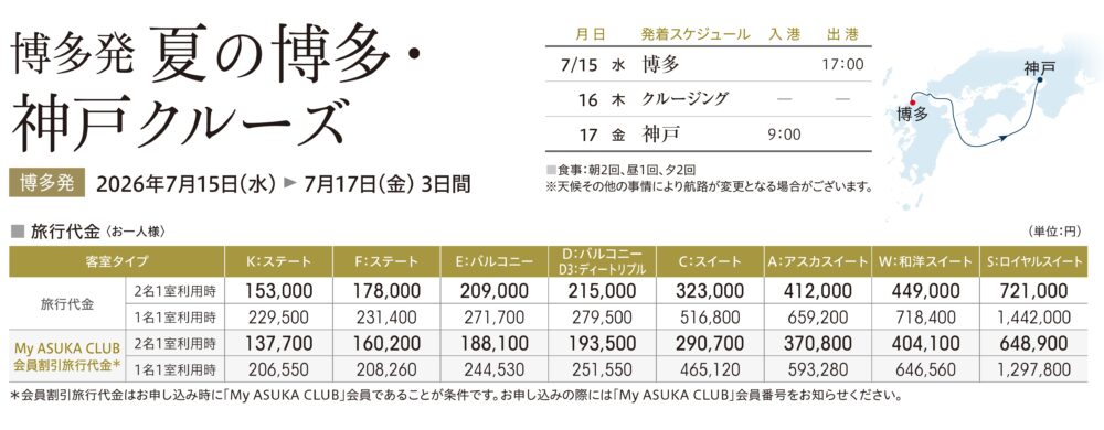 飛鳥2の2泊3日の最安値は13.7万円~(2名1室利用&My ASUKA CLUB会員)となっております。