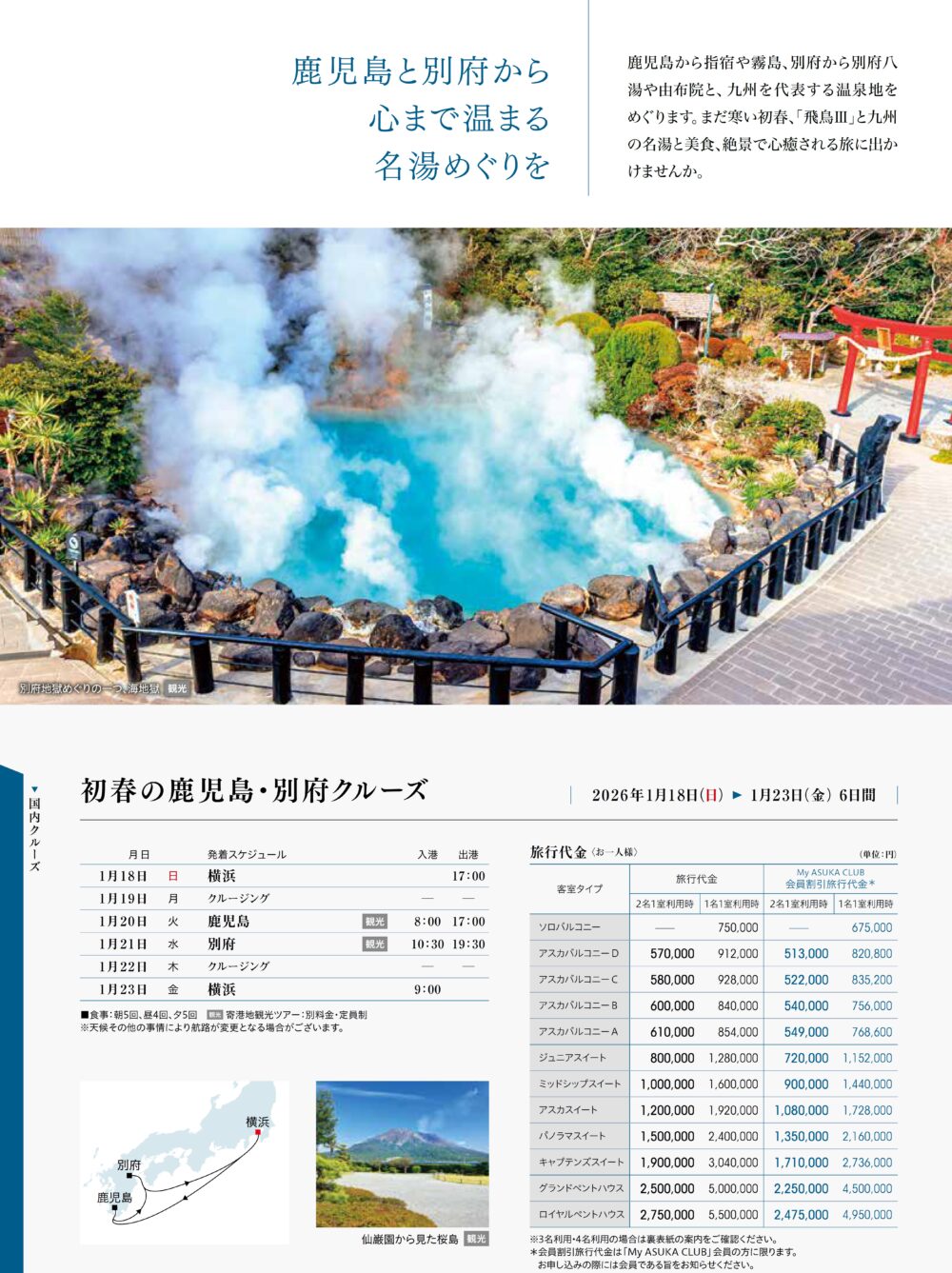 | 初春の鹿児島・別府クルーズ 6日間 | 1月18日(日)〜1月23日(金) | 513,000 円~ | HISで確認 |