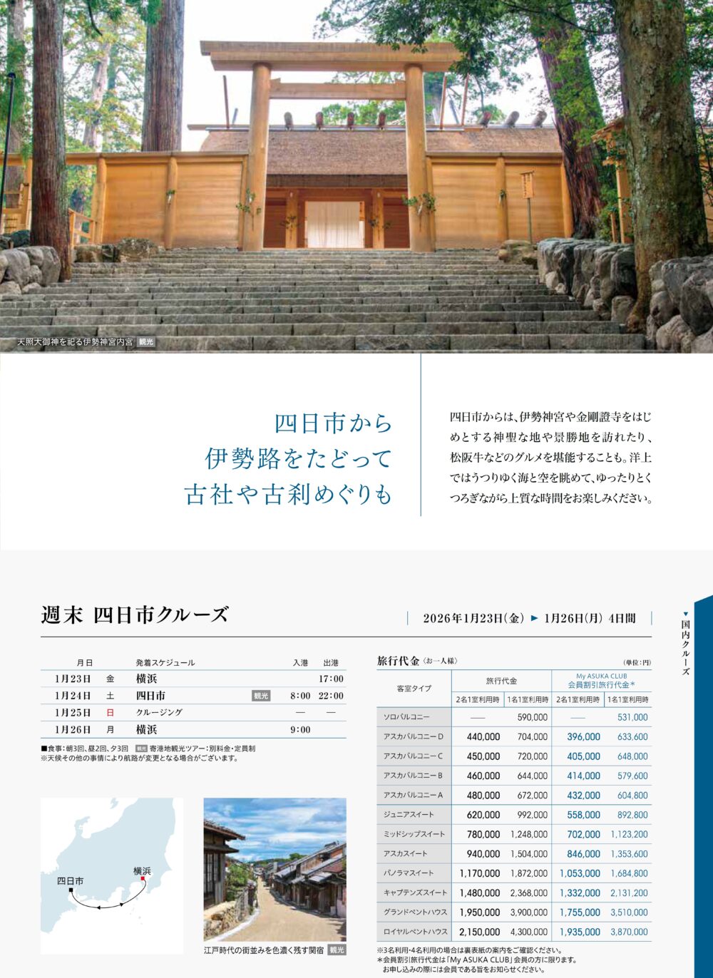 | 週末 四日市クルーズ 4日間 | 2026年1月23日(金)〜1月26日(月) | 396,000 円~ | HISで確認 |