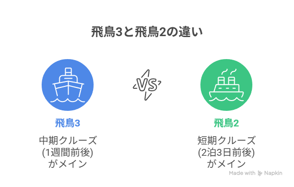 飛鳥3は中長期クルーズ、飛鳥2は短期クルーズがメインです。