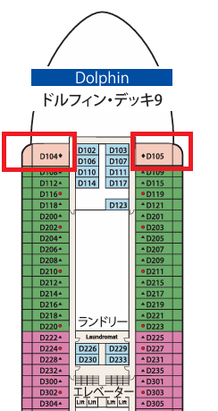 また、ジュニア・スイートと海側バルコニーでは、「中央」「前方・後方」でクルーズ費用が異なります。なぜなら、アクセスが良く、揺れにくい「中央」客室は人気があります。そのため、クルーズ費用の設定が少し高めに設定されているからです。