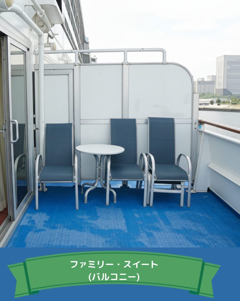 海側バルコニーの室内の様子はButeクルーズさんの動画がとても分かりやすいのでぜひご覧ください。