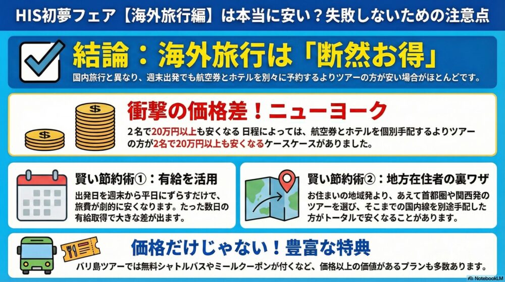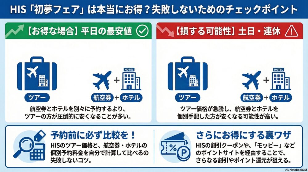 前回(初夢フェア2025)の「最もお得なセールはどれか?」の分析(HISツアー vs. 個別予約の比較)