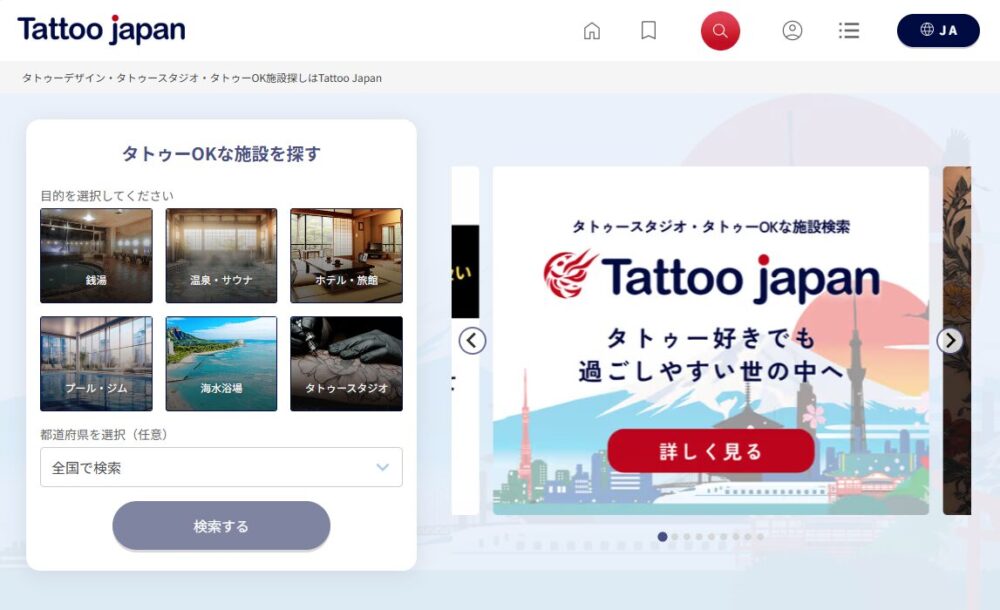 TattooJapan(タトゥージャパン)は、タトゥー愛好者向けの施設検索ポータルサイトです。日本全国のタトゥーOK施設やタトゥースタジオなどを簡単に検索できます。